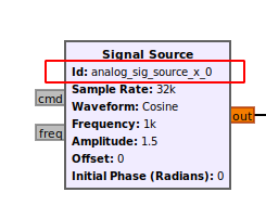 id 对于每个 block 都是唯一的,用于辨别这个 block。在 GRC 中就是每个 block 的 UI 界面上显示的“Id”,可视化效果如下: