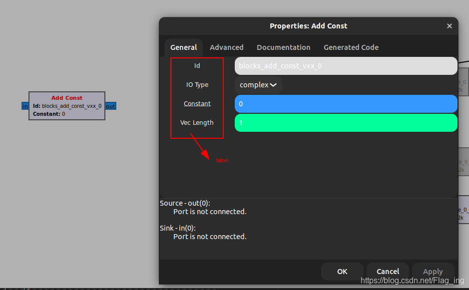 label只是块的一种注释,便于使用者理解,并且在 GRC 中是可见的。它不会出现在生成的代码中,可视化效果如下: