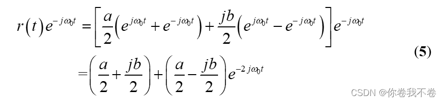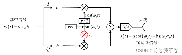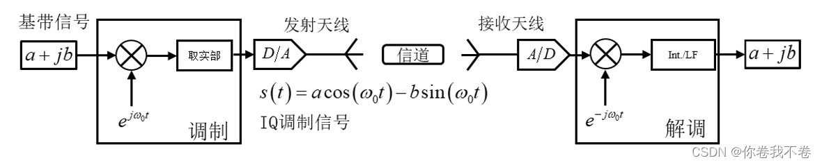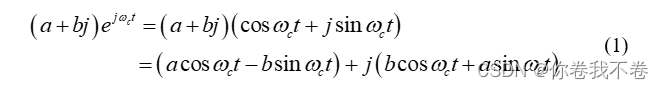 的形式,因此对于任意一个复数的实部与虚部来说总是正交的。进而,假设我们要发送的基带信号中的一个码元为 a+bj ,则在 IQ 调制过程中,a 作为同相分量 I,b 做为正交分量 Q。首先对码元进行上变频的结果下式所示。