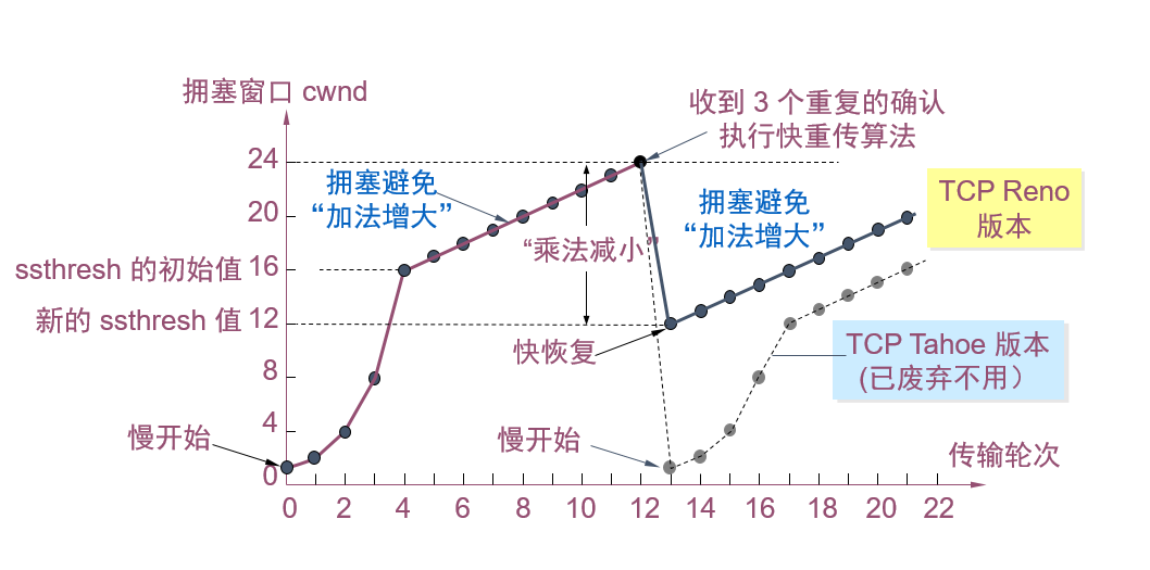 当网络超时时,会执行“乘法减小”算法令ssthresh变为cwnd的一半,而后执行“加法增大”,令cwnd等于当前的ssthresh开始发送报文段,而后每次增加1,开始缓慢的增长。快恢复是相对于慢开始而言的,当出现网络超时时,采用快恢复则会较快的恢复网络超时前的传输速度,而继续采用慢开始算法则会需要较长的时间。