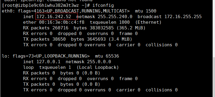 [root@izbp1e9c6hiwhu382m3t3wz ~]# ipconfig