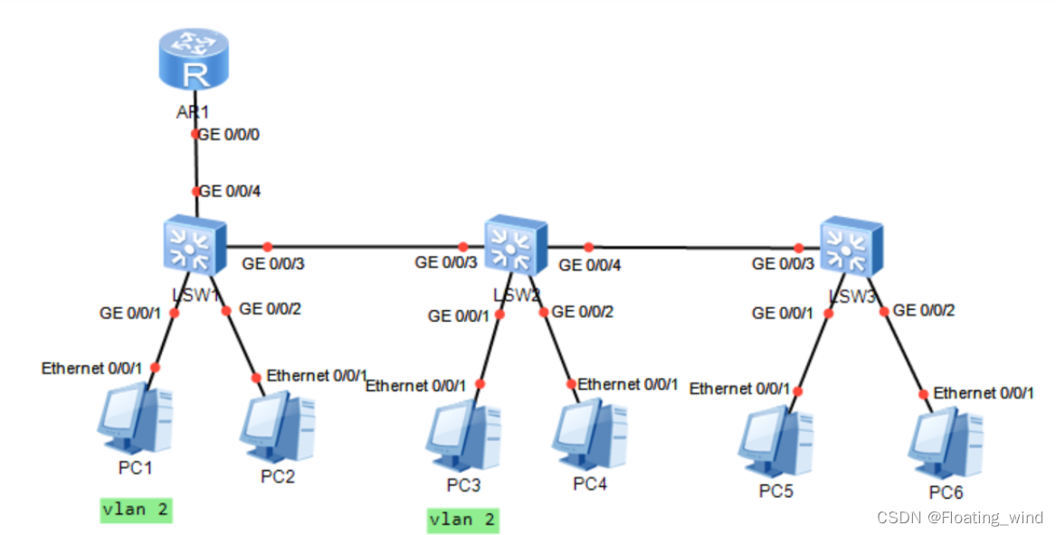 [sw1-GigabitEthernet0/0/3]port hybrid untagged vlan 3 4 5 6 ---允许不带标签的帧通过vlan 3 4 5 6