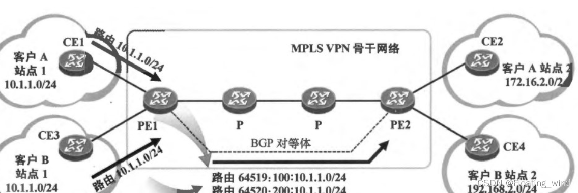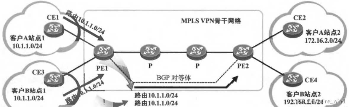 使用BGP协议来进行传递。则中间的P设备(服务提供商的设备),只需要完成路由信息的高
