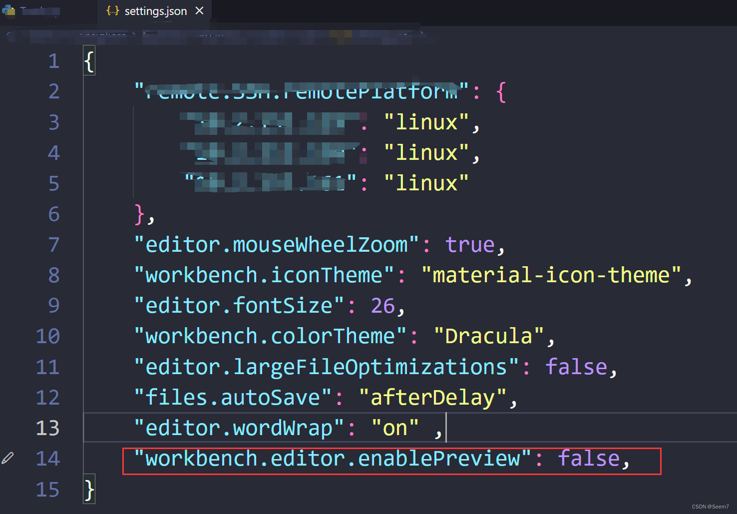 在打开的settings.json中增加一行配置语句"workbench.editor.enablePreview": false,