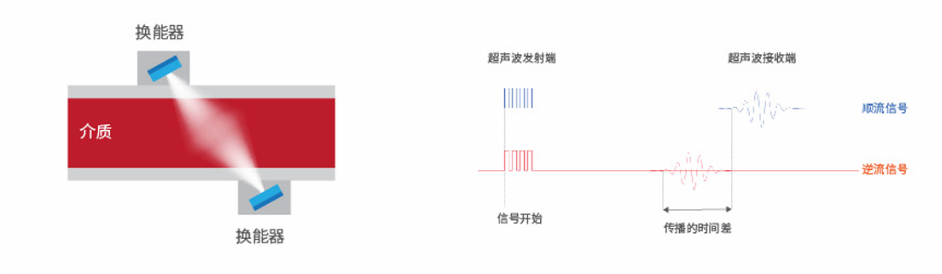 传播时间法是利用超声波在管道内顺流和逆流经过待测液体时,因为流体本身流速的影响,造成超声波在经过待测流体后沿着顺流方向传播时速度增大,沿着逆流方向传播时速度减小,导致超声波传播一段固定距离所需时间不同,利用这段时间不同作为出测量发点的方法被称为传播时间法,根据测量量的不同又进一步分为时差法,频差法等。