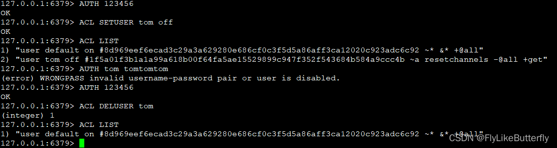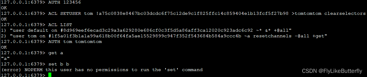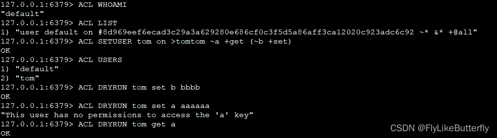 - 使用客户端连接redis并使用ACL SETUSER设置用户的acl规则;