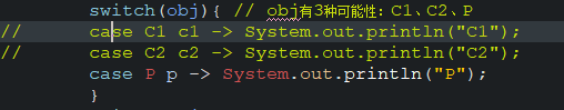 case P p -> System.out.println("P"); // 父类可覆盖所有子类可能性