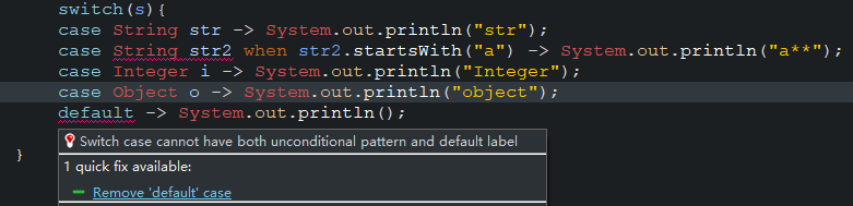 使用模式匹配或null的case必须要有穷尽性(表达式类型是char, byte, short, int, Character, Byte, Short, Integer, String,enum以外的),case要覆盖所有可能的匹配类型,否则需要用default补充剩余可能的case;