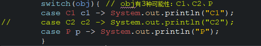 default -> System.out.println("default"); // default补充了可能是C1或者P