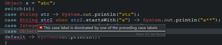 另一个需要注意的点是case的条件顺序,前面的case条件不能完全覆盖后面的case条件,否则的后面的条件就永远不会执行(类似try的catch参数);(现代开发工具都会表明这种错误)