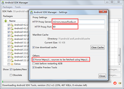 在 Android SDK Manager主界面,依次选择Tools-Options,在Setting弹出框中,分别设置HTTP Proxy Server和HTTP Proxy Port为mirrors.neusoft.edu.cn和80,并勾选上Force https://... sources to be fetched using http://...复选框。