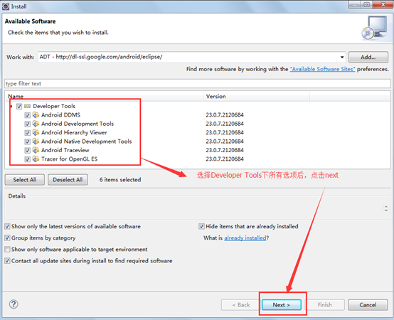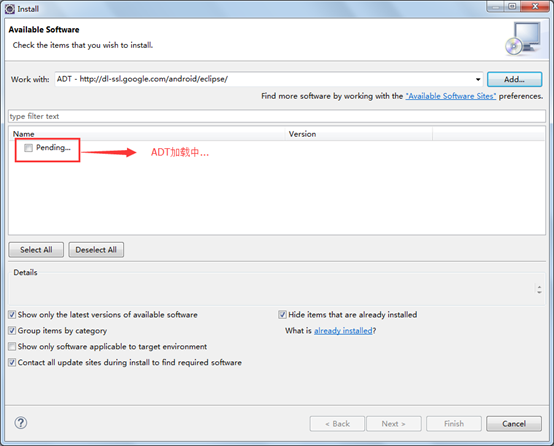 点击OK按钮后,进入ADT的加载页面(这里要FQ,否则ADT加载不成功)。如果加载失败,首先确定网络是否可以访问谷歌,若网络正常,则可以再次Add,加载ADT。