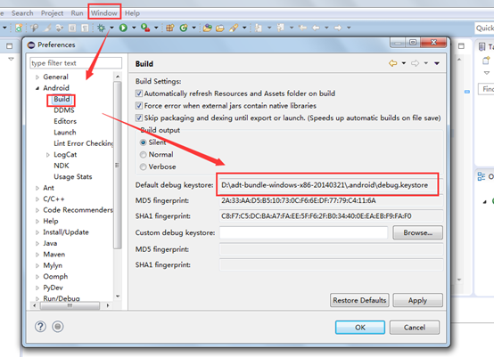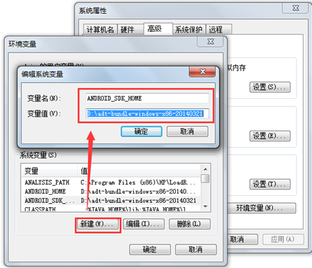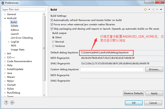 在系统变量中,新建ANDROID_SDK_HOME,并且配置地址。比如,我这里配置的路径为D:\adt-bundle-windows-x86-20140321。保存后,再查看eclipse-window-preference中,Android-build中default debug.keystore的路径是否修改为已配置路径。