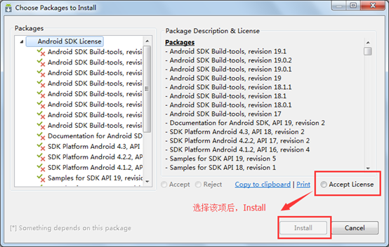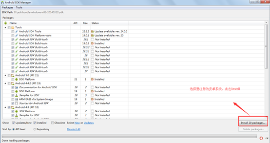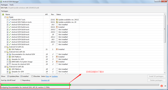 由于之前已经下载并解压SDK,此时,会拉取已下载好的API,显示为Installed,未下载的显示为Not Installed。这时,你只需要选择你所需的Not Installed的系统版本,进行下载。