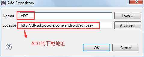 在Add Repository页面,输入你要获取插件的名字和地址,其中地址一定要输入正确。由于我们要获取ADT,所以我们这里输入名字为ADT,地址为ADT的下载地址: