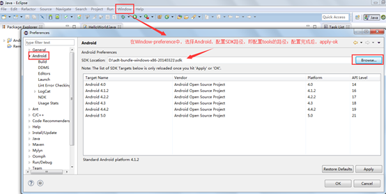ADT安装完成之后,需要在window-preference-Android中,配置SDK Location,即配置sdk中tools所在目录路径。