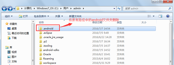 如上图所示,环境变量中虽然配置了ADROID_SDK_HOME的路径,但是eclipse中仍显示原有默认的路径。这是因为eclipse会先去找默认的文件,如果有,就选用,如果没有,才会去找ANDROID_SDK_HOME目录下的AVD路径。所以我们删除默认的.android文件。
