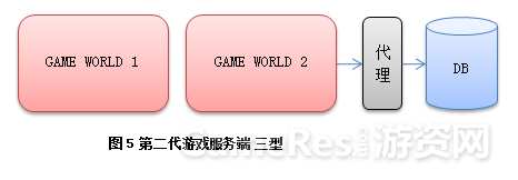 游戏服务器压力拆分后得意缓解,但是两台游戏服务器同时访问数据库,大量重复访问,大量数据交换,使得数据库成为下一个瓶颈。于是形成了数据库前端代理(DB Proxy),游戏服务器不直接访问数据库而是访问代理,再有代理访问数据库,同时提供内存级别的cache。早年 MySQL4之前没有提供存储过程,这个前端代理一般和 MySQL跑在同一台上,它转化游戏服务器发过来的高级数据操作指令,拆分成具体的数据库操作,一定程度上代替了存储过程: