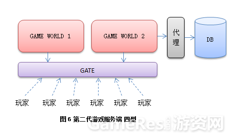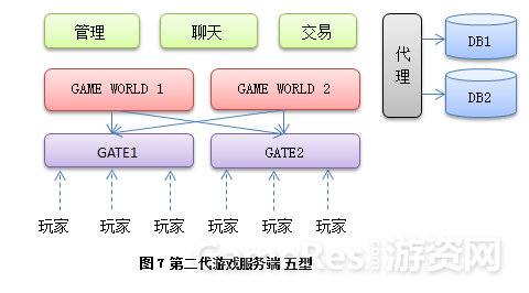 把网络功能单独提取出来,让用户统一去连接一个网关服务器,再有网关服务器转发数据到后端游戏服务器。而游戏服务器之间数据交换也统一连接到网管进行交换。这样类型的服务器基本能稳定的为玩家提供游戏服务,一台网关服务1-2万人,后面的游戏服务器每台服务5k-1w,依游戏类型和复杂度不同而已,图中隐藏了很多不重要的服务器,如登录和管理。这是目前应用最广的一个模型,到今天任然很多新项目会才用这样的结构来搭建。