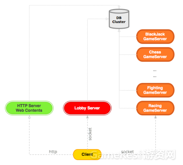 休闲游戏同战网服务器类似,都是全区架构,不同的是有房间服务器,还有具体的游戏服务器,游戏主体不再以玩家 P2P进行,而是连接到专门的游戏服务器处理: