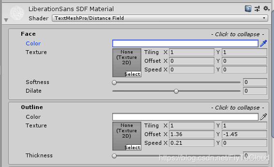 - Face:控制内部的表现(外轮廓以内的字体部分),和outline联合使用,其中:【Color】是内部颜色,该颜色会合字体顶点色(组件面板的Vertex Color)叠加在一起作为最终字体的颜色。【Softness】是会控制外轮廓的柔和程度。【Dilate】控制的是内部区域的大小。texture同outline,不过纹理会叠加到内部区域。