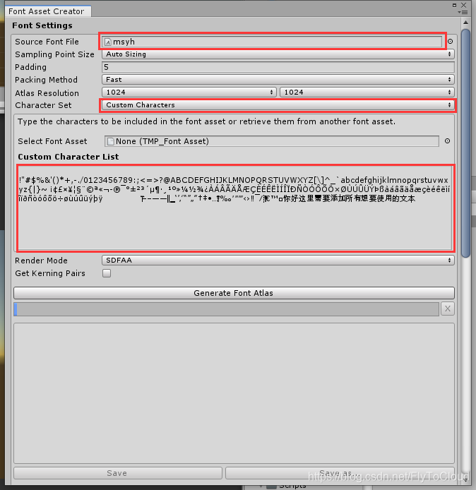 - Custom Character List中添加需要用到的中文字符,点击保存就得到支持中文的TMP字体了。