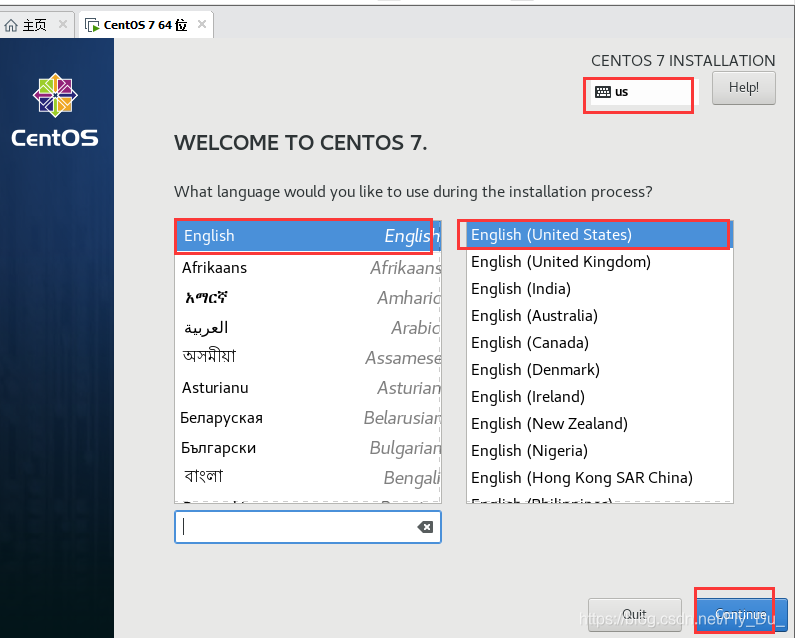 选择安装过程中使用的语言,选择英文、美式键盘,点击Continue