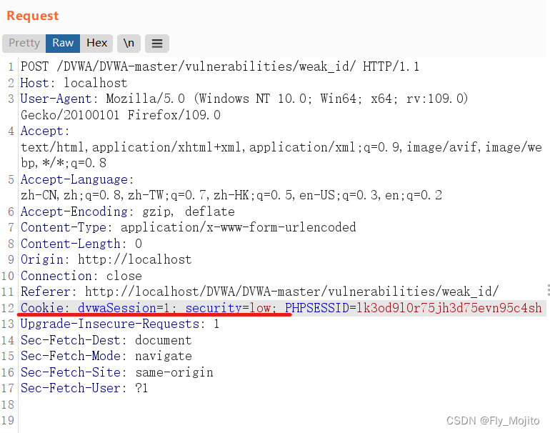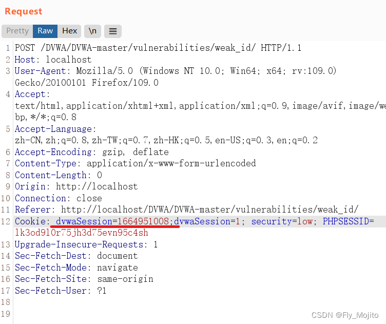 url设置为:http://localhost/DVWA/DVWA-master/vulnerabilities/weak_id/cookie:dvwaSession=1; PHPSESSID=n9qd71ocqkjle1rdtbcs5f5be4; security=low