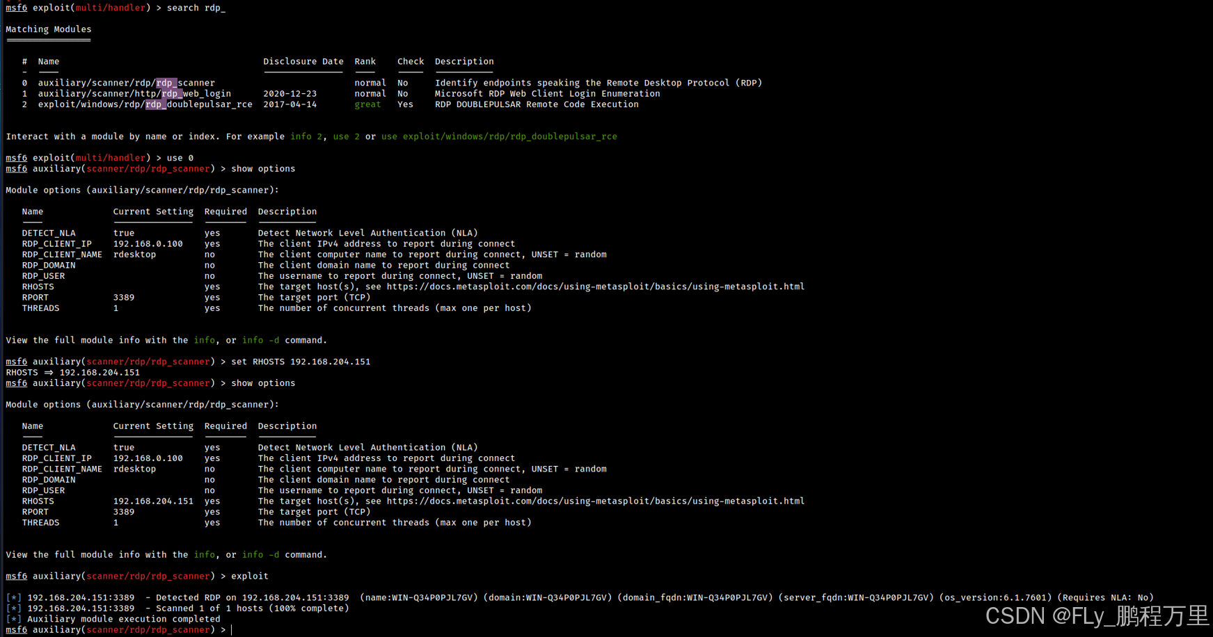 msf6 auxiliary(scanner/rdp/rdp_scanner) > set RHOSTS 192.168.204.151