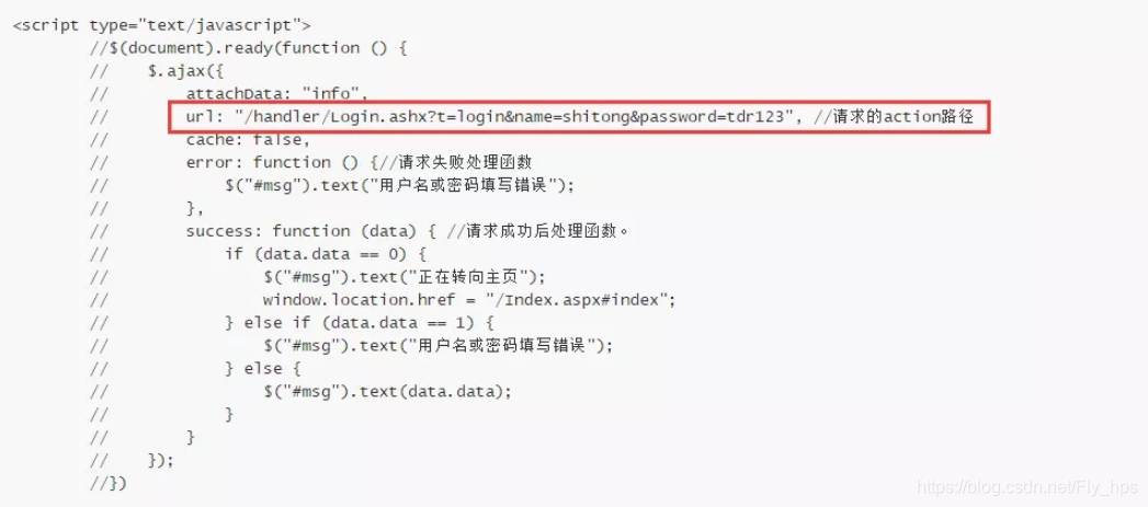 b). 查看源代码发现有一段注释代码,发现存在用户名和登录密码及请求路径。