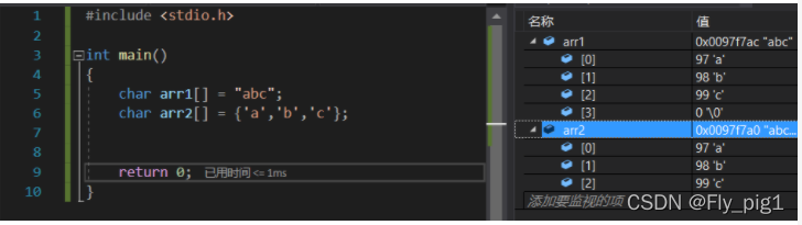 从上面的图中我们可以看到这两个数组的区别就是arr1字符串数组中隐藏了\0,而arr2没有\0这个结束标识符;