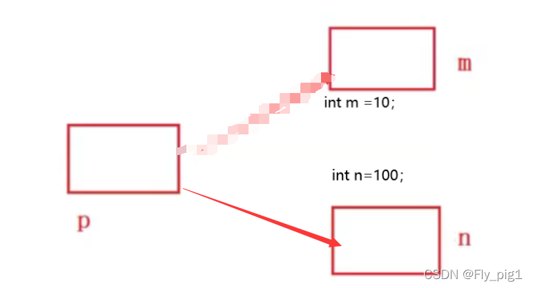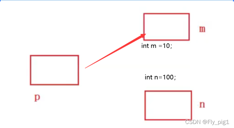 这里我们明白p是指针类型的一个变量,p里面存的是m的地址。如果这句话不理解,可以这么理解,既然m的地址存放在p中,那我们是不是通过p就可以找到了m了,很像是p指向了m。