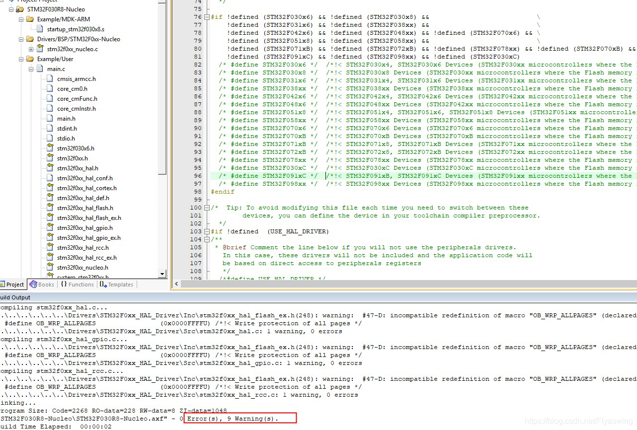 在STM32F0的HAL库工程中,stm32f0xx.h头文件用于根据宏定义选择器件。当在Keil中修改器件型号时,需手动更新该文件中的宏定义,以消除编译警告。同步修改宏定义后,警告将消失。