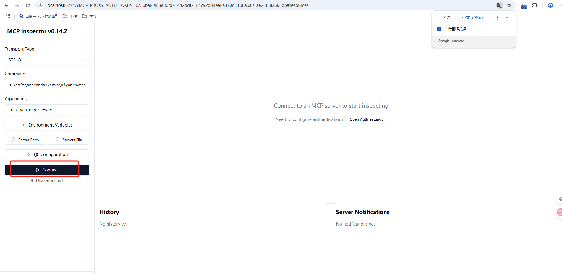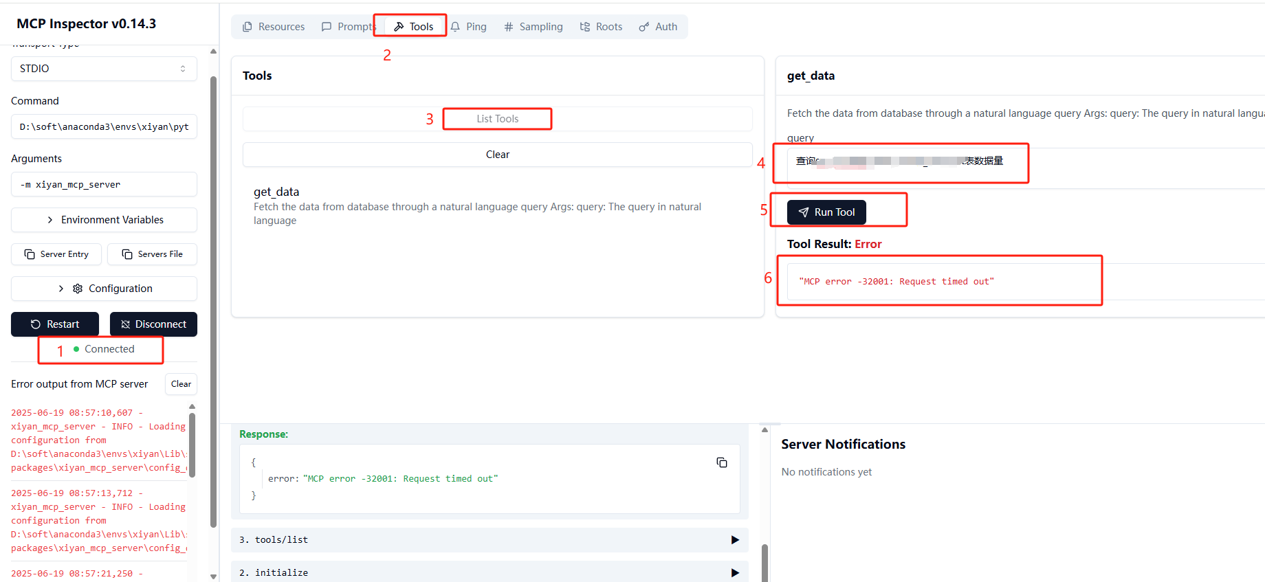 在命令行中执行命令:npx @modelcontextprotocol/inspector -e YML=D:\soft\anaconda3\envs\xiyan\Lib\site-packages\xiyan_mcp_server\config_demo.yml D:\soft\anaconda3\envs\xiyan\python -m xiyan_mcp_server