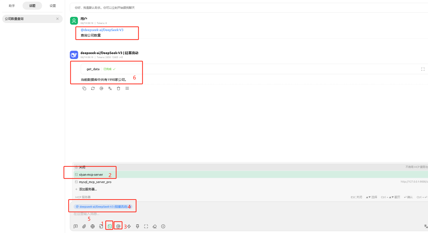 在模型中选择xiyan_mcp_server,连接数据库查询数据