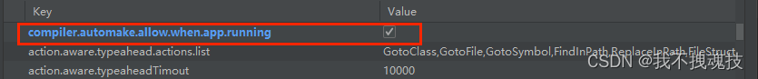 按Ctrl+Shift+Alt+/快捷键调出Maintenance页面,单击Registry,勾选compiler.automake.allow.when.app.running复选框
