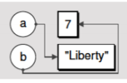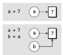 第一行,我们先在内存中创建了一个标识符“a”,再在另一块内存区域中创建了一个int类型的变量对象:7,将标识符“a”指向“1”这个对象所在的内存块