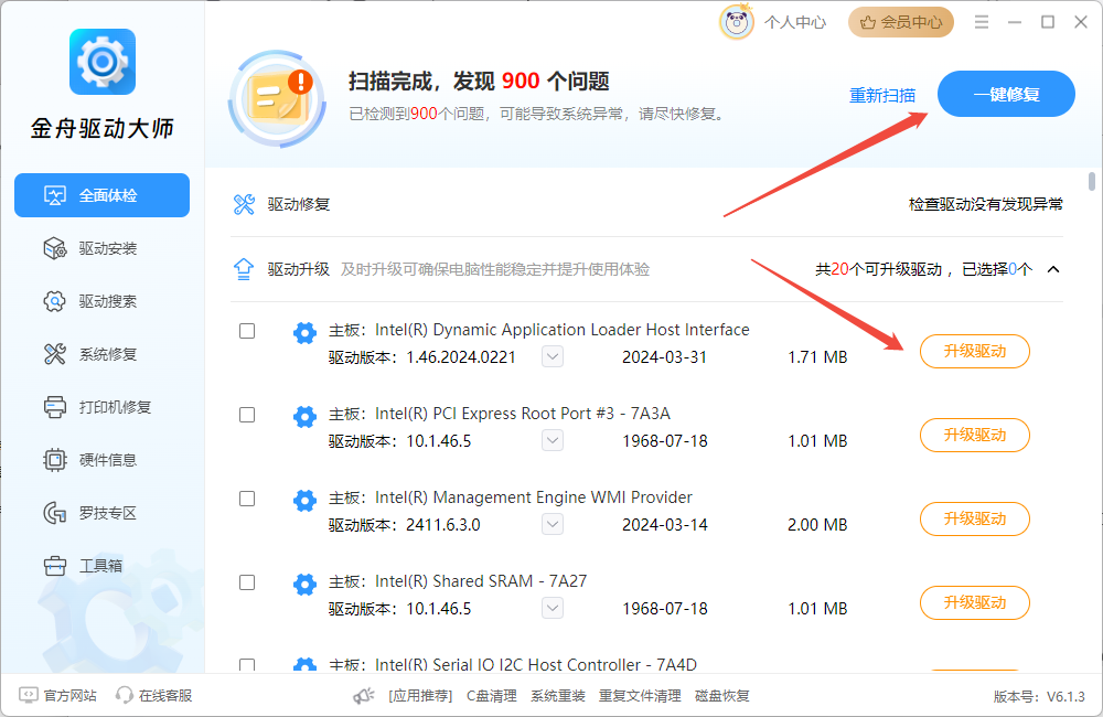 第3步:找到异常驱动,点击“一键修复”或“升级驱动”,完成后重启电脑。