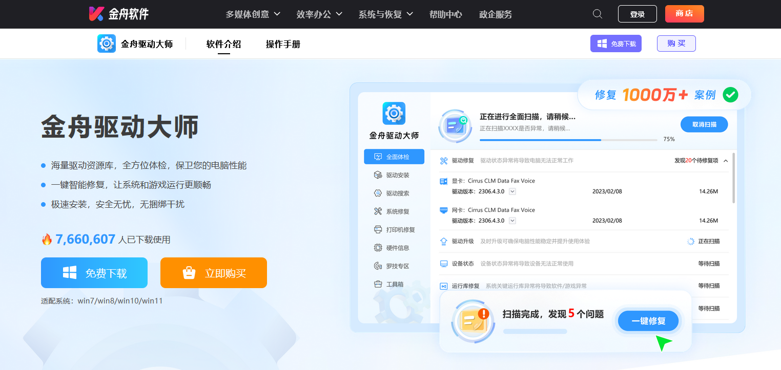 方法2:使用驱动管理工具(如金舟驱动大师)