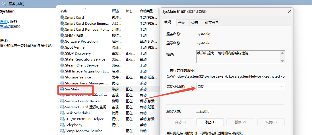 第2步:找到“SysMain”(Win10)或“Superfetch”(Win7),右键选择“属性” → 启动类型设为“自动”,点击“启动”服务。