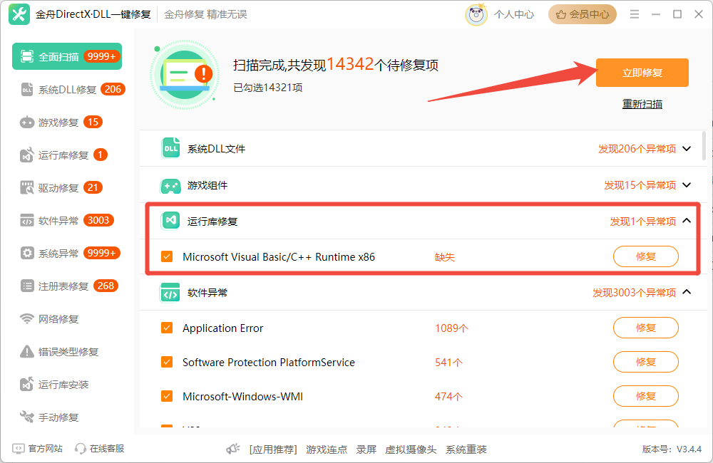 第3步:扫描后,软件自动勾选缺失的“VC2005运行库”选项,点击“立即修复”自动下载并安装组件。