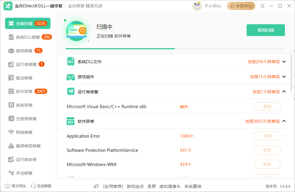 第2步:启动工具后,自动检测缺失的DLL文件及运行库。