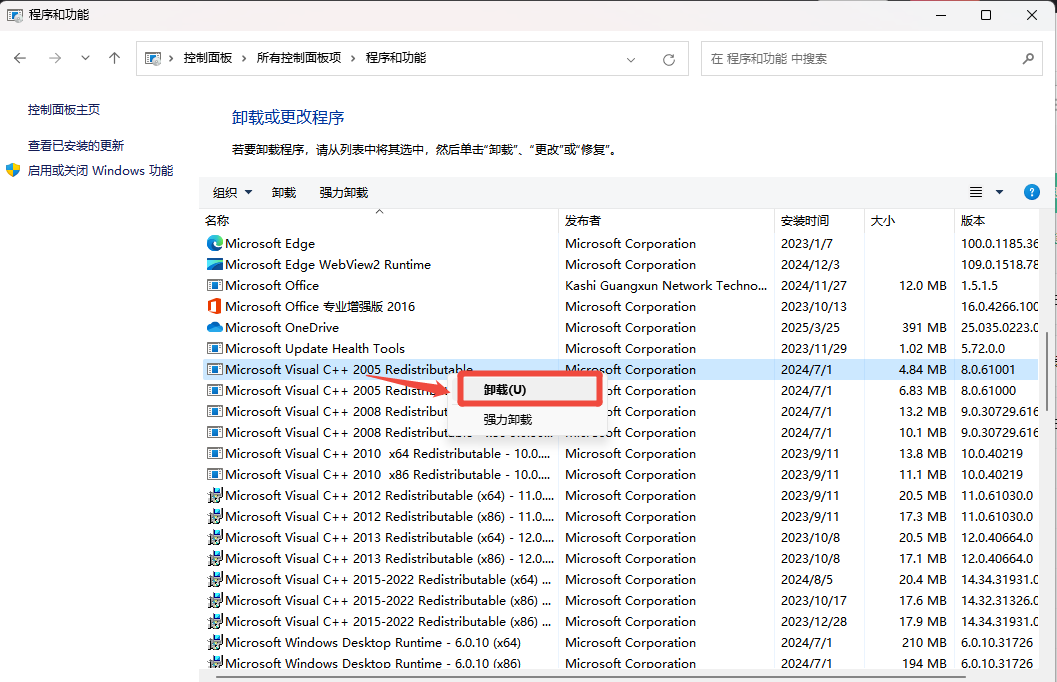 第2步:卸载旧版VC2005运行库,重新安装最新版本。