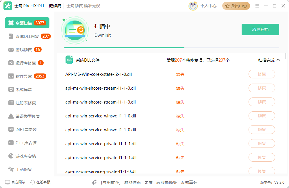 ✅智能扫描:自动检测缺失/损坏的DLL文件,精准定位问题。