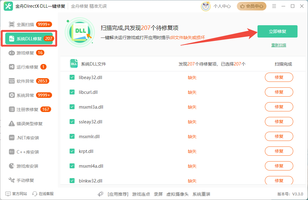 第3步:选择【系统DLL修复】 → 点击【立即修复】 → 自动下载并替换缺失的DLL文件。