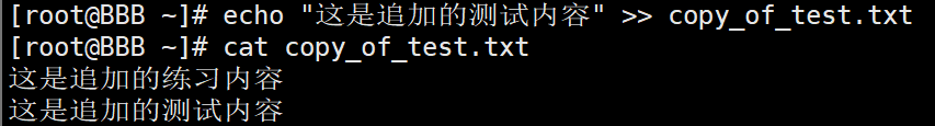 (2). 向copy_of_test.txt文件中追加一行内容 “这是追加的测试内容”,并使用命令查看文件内容确认追加成功。