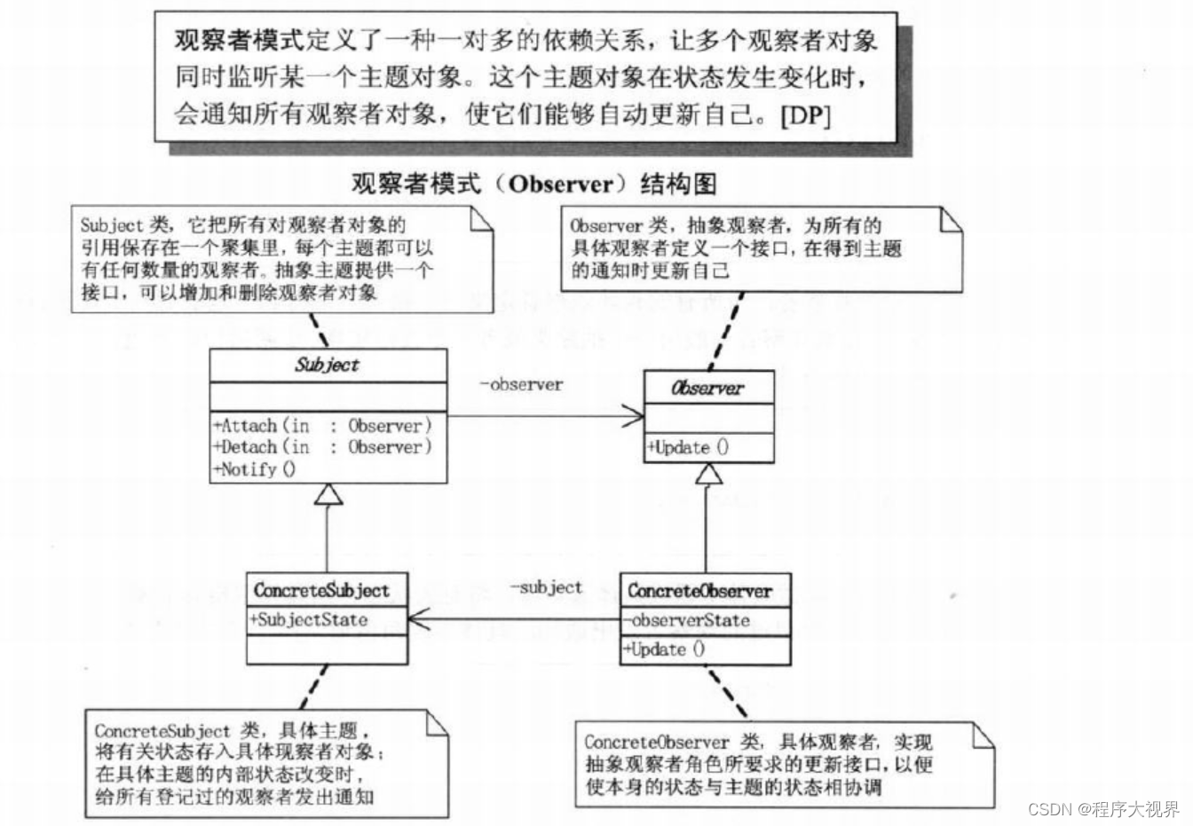 基本概念:定义了一种一对多的依赖关系,让多个观察者对象同时监听某一个主题对象。这个主题对象在状态发生变化时,会通知所有观察者对象,使它们能够自动更新自己。将一个系统分割成一系列相互协作的类有一个很不好的副作用,需要维护相关对象间的一致性。否则为了维持一致性使各类紧密耦合,给维护、扩展和重用都带来不便。