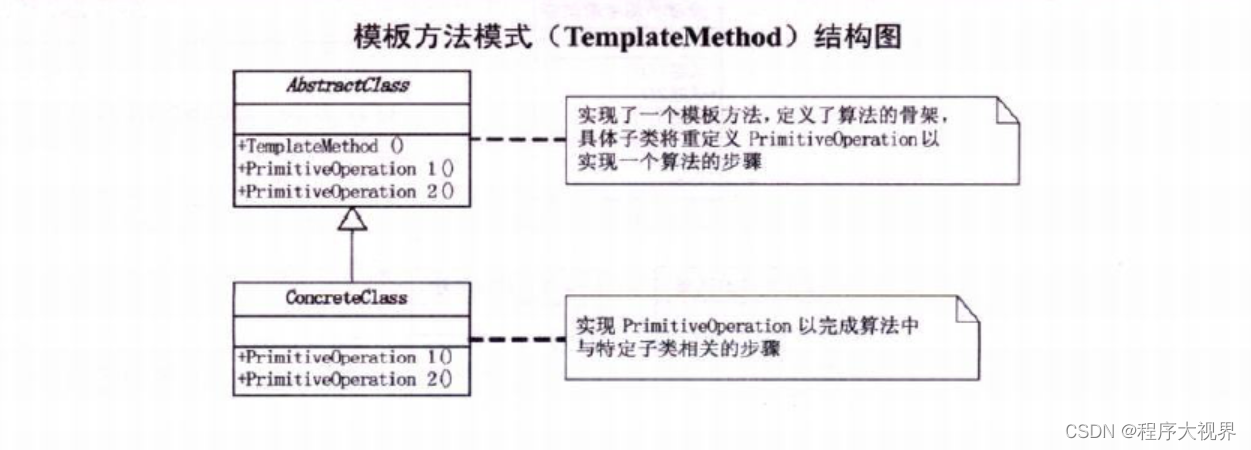 概念:定义一个操作中的算法的骨架,将一些步骤延迟到子类中,模板方法使得子类可以不改变一个算法的结构即可重定义该算法的某些步骤。