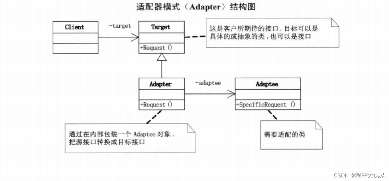 - 适配器角色(Adaptor):适配器模式的核心角色,其他两个角色都是已经存在的角色,适配器角色是需要新建立的,职责简单:通过继承或是类关联的方式把源角色转换成目标角色。