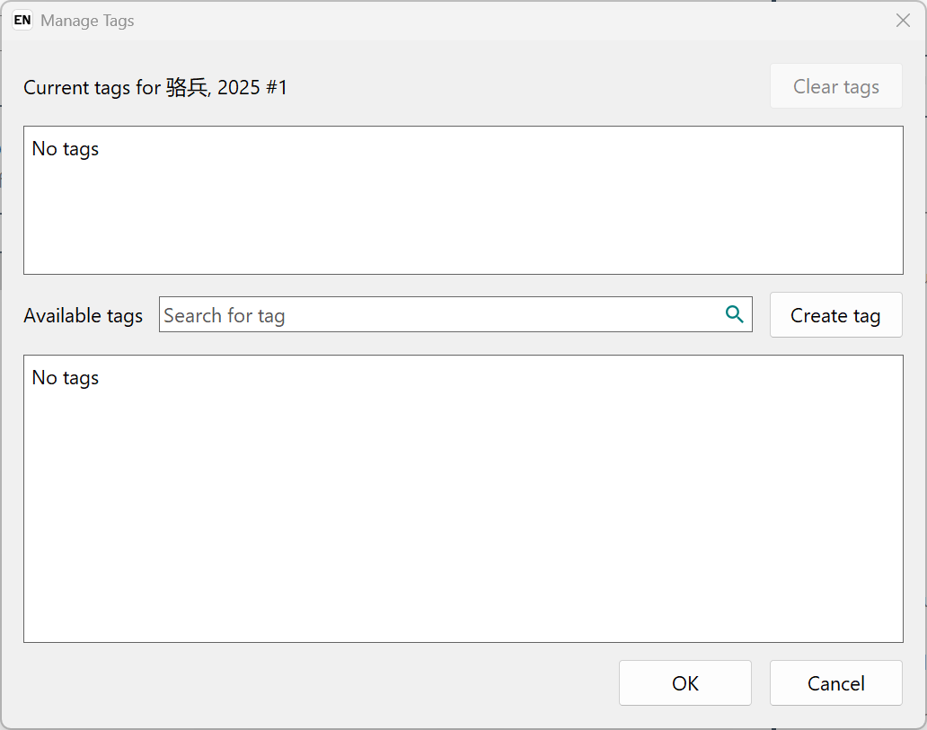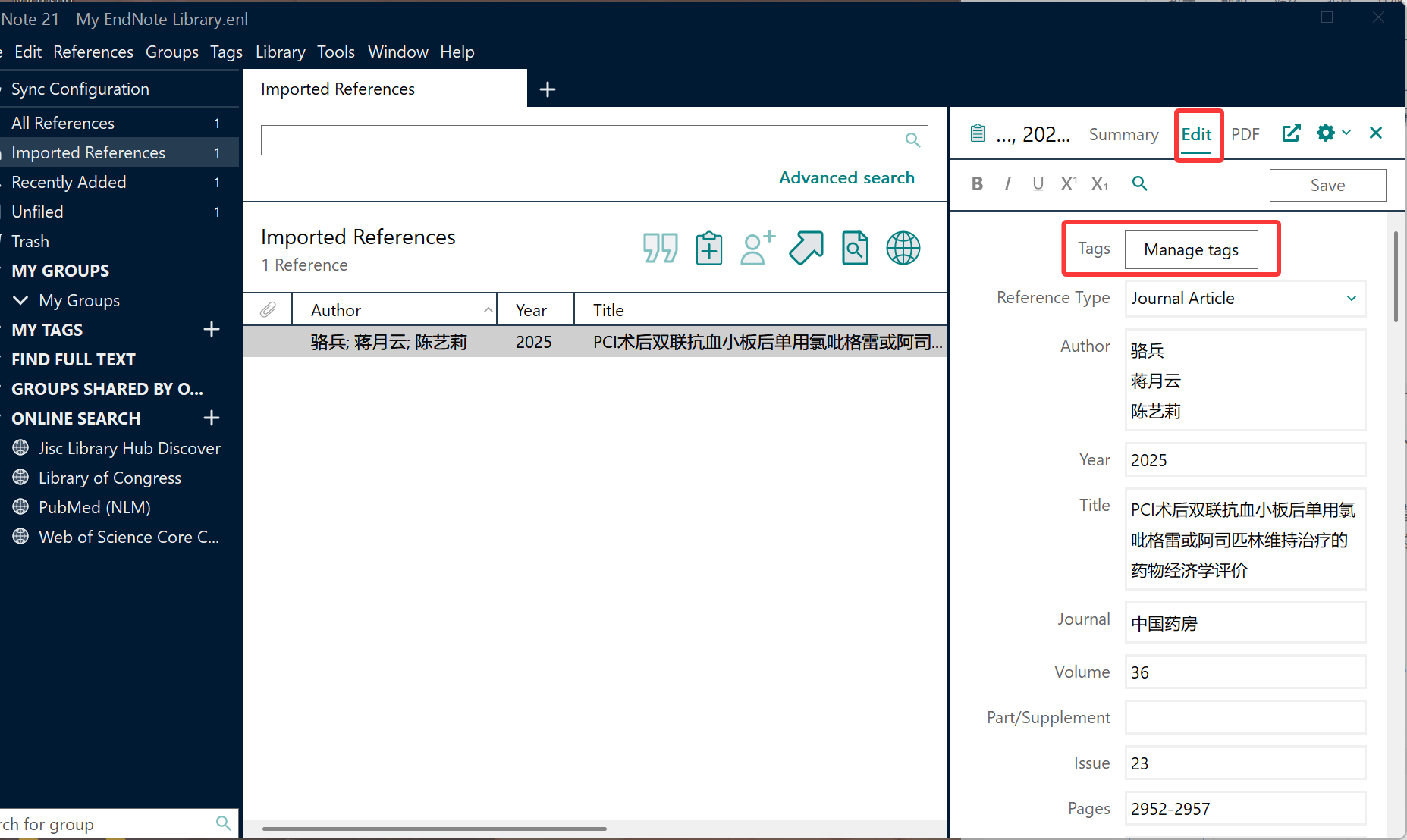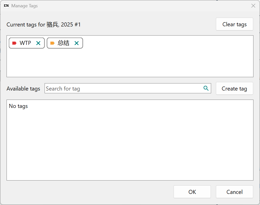 通过右键想要添加Tag的文献-Manage Tags或者点击想要添加Tag的文献,在右边的Edit面板中选择Manage Tags打开标签管理页面